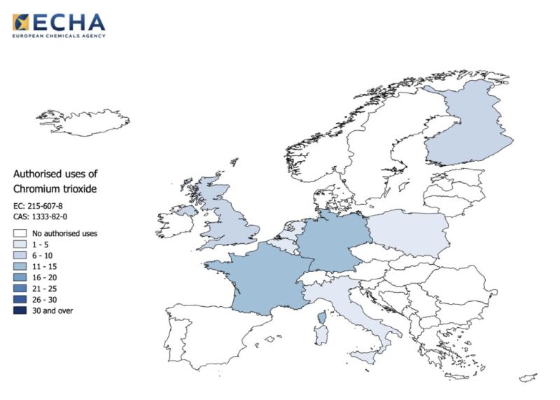 Até pouco tempo, a legislação europeia sobre o uso de cromo hexavalente era no regime de autorizações individuais, e muitas já eram concedidas, como se observa na imagem, de 2018, que mostra a distribuição dessas autorizações por país.