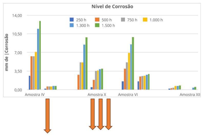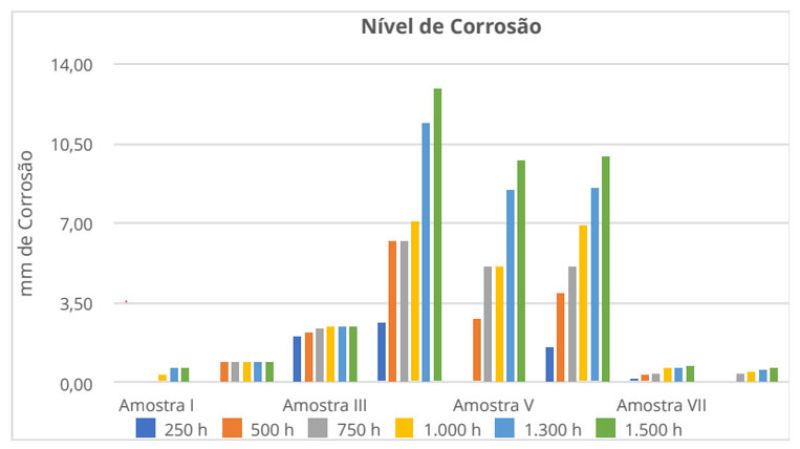 Os corpos de prova pintados, obtidos das oito soluções de conversor, foram submetidos a ensaios de corrosão acelerada, e os resultados foram planilhados em gráficos de colunas para comparar a evolução do processo corrosivo. A Figura 11 mostra o nível de corrosão em processo de pintura com a solução de conversão preparada com cada amostra de água industrial, para o mesmo substrato (perfil A). Independentemente do processo de conversor de camada, pode‑se observar uma grande diferença entre as amostras no processo corrosivo: as amostras de água com maior presença de íons deram origem a corpos de prova pintados com maior processo de corrosão.