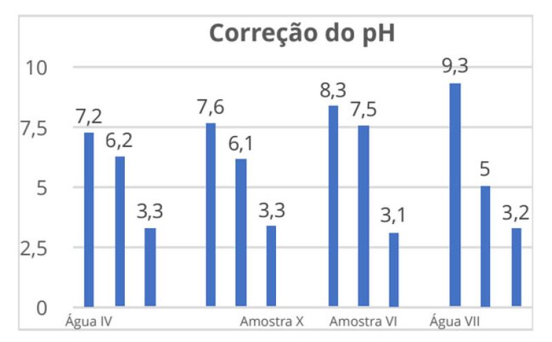 As amostras IX, X, XI e XII correspondem às amostras IV, V, VI e VII com pH corrigido. A sequência aplicada às amostras de água é descrita abaixo.