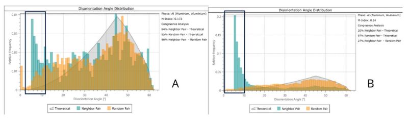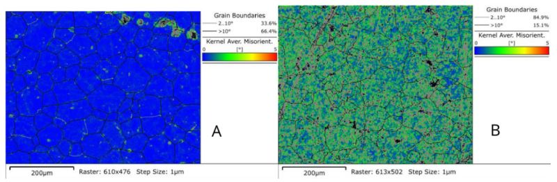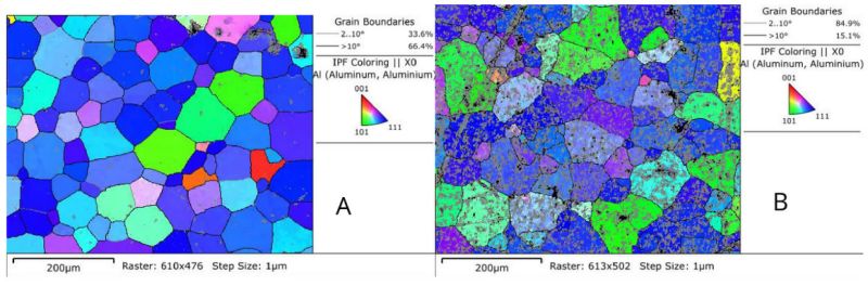 Na Figura 04 observa‑se, na amostra do Perfil A, que poucos grãos concentram a deformação (grãos em tons esverdeados), caracterizando uma heterogeneidade na deformação. Na amostra do Perfil B nota‑se um número maior de grãos concentrando a deformação, caracterizando uma homogeneidade maior. No mapa de desorientação média do grão (Figura 05) a amostra do Perfil A indica que a maior parte da área analisada está na cor azul, indicando poucas desorientações. Já a amostra do Perfil B apresenta uma distribuição mais homogênea da deformação, com quase todos os grãos em tons verdes, indicando que a deformação está dispersa por toda a região analisada. Isso reflete uma maior densidade de defeitos cristalinos, resultando em deformação mais intensa. É como se a fase do cristal cúbico tivesse sido levemente deslocada, o que pode estar relacionado à velocidade de extrusão e, consequentemente, à menor resistência à corrosão.