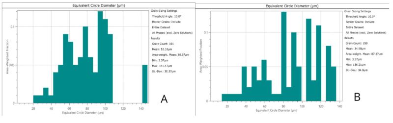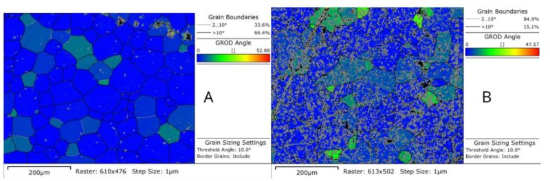 O gráfico de distribuição do tamanho de grãos, Figura 03, mostra que na amostra do Perfil A a distribuição de tamanho de grãos é homogênea, predominantemente na faixa entre 55 e 105 μm. Na amostra do Perfil B a distribuição de tamanho de grãos é heterogênea, com duas faixas principais de 38 a 62 μm e de 80 a 138 μm. Os mapeamentos usados para analisar a distribuição da deformação (desorientações de baixo ângulo) mostram que os grãos possuem um sentido de orientação preferencial. Quando a média dos pixels de um grão apresenta um sentido diferente, observa‑se uma desorientação, que pode indicar deformação ou presença de defeitos. Os mapas de orientação revelam como os grãos estão orientados em um material.
