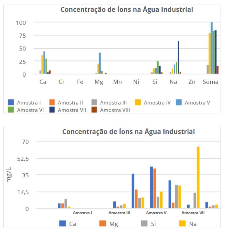 A Tabela 05 apresenta os resultados das análises de pH, condutividade e concentração de íons para cada amostra de água industrial. Na primeira linha são mostrados os resultados de pH; observa‑se que as amostras de água das empresas aplicadoras têm tendência alcalina. Na segunda linha, são apresentados os resultados de condutividade, onde se observam valores acima do recomendado para cinco amostras. Quanto à concentração de íons, existem seis amostras com pelo menos dois elementos com concentração acima do recomendado, principalmente para os elementos Ca, Mg, Si e Na. A Figura 08 mostra gráficos de colunas comparando a concentração de íons nas amostras de água industrial; no gráfico da esquerda observa‑se que os íons Cr, Fe, Mn, Ni e Zn apresentam concentração muito baixa ou não estão presentes nas amostras de água, enquanto os íons Ca, Mg, Si e Na apresentam altas concentrações. No gráfico da direita observa‑se a concentração de íons por amostra de água; as amostras IV, V, VI e VII apresentam concentrações para Ca, Mg, Si e Na muito acima do recomendado. Considerando que o pH para as águas de processo deveria estar na faixa entre 4,5 e 7,5, observa‑se que há três amostras acima dessa faixa.