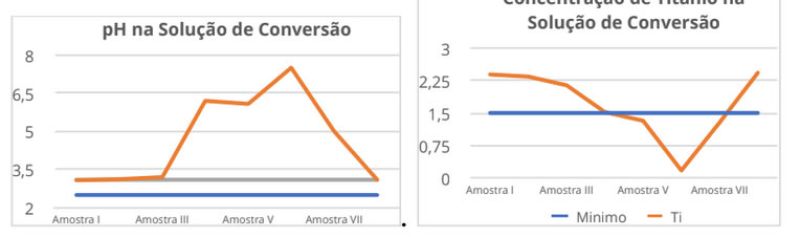 Na Figura 10 observa‑se que o pH das soluções de conversor permanece na faixa recomendada (2,5–3,1) apenas nas soluções com menor concentração de íons (II, III e VIII). Comparando os dois gráficos, chama a atenção que os perfis de pH e de concentração de titânio têm inversão: quanto maior o pH, menor é a concentração de titânio na solução. Como as soluções foram preparadas com a mesma quantidade de titânio, o pH alcalino mascara a concentração medida. Portanto, para determinar a concentração de titânio da solução de conversor é necessário corrigir o pH para a faixa recomendada.