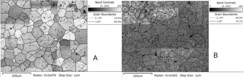 Novas amostras dos perfis A e B, sem pintura, foram analisadas em um microscópio eletrônico de varredura (MEV) acoplado a um detector de difração de elétrons retroespalhados (EBSD). Os resultados são apresentados na forma de mapas com os grãos coloridos. A Figura 02 apresenta o mapa de contrastes de bandas em que se visualizam as microestruturas das amostras e os contornos de grãos. Na amostra do Perfil A, os grãos possuem contornos poligonais bem definidos e retilíneos (limites de grãos com ângulos > 10° – 66,4 %). Já a amostra do Perfil B apresenta baixa indexação; entretanto, nota‑se que os grãos possuem contornos poligonais (limites de grãos com ângulos < 10° – 84,9 %).