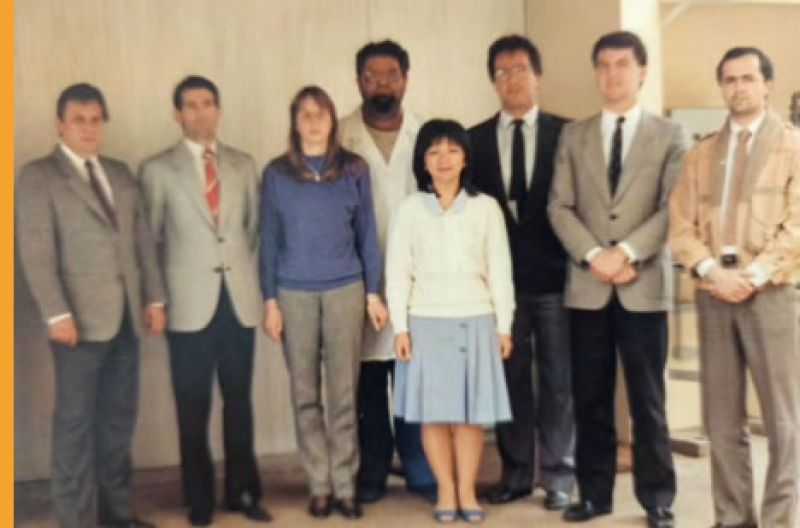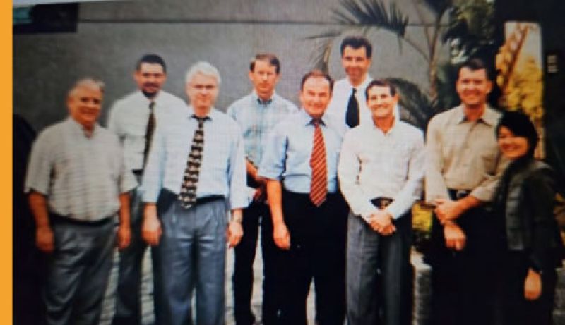 Foto 6 – Da esq. para dir.: Ismael; Eládio, já como gerente comercial da Degussa; Edivani; Moacir; Wilma; Rubens; Paulo e Wladimir e equipe do GT.