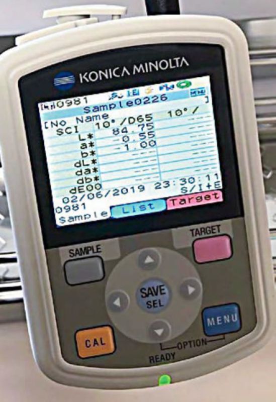 A medição com um espectrofotômetro de esfera produz valores de L estáveis, de 83 a 85, e valores de b de -0,5 a -1,5. O valor de a é constantes entre -0,5 e -0,8.