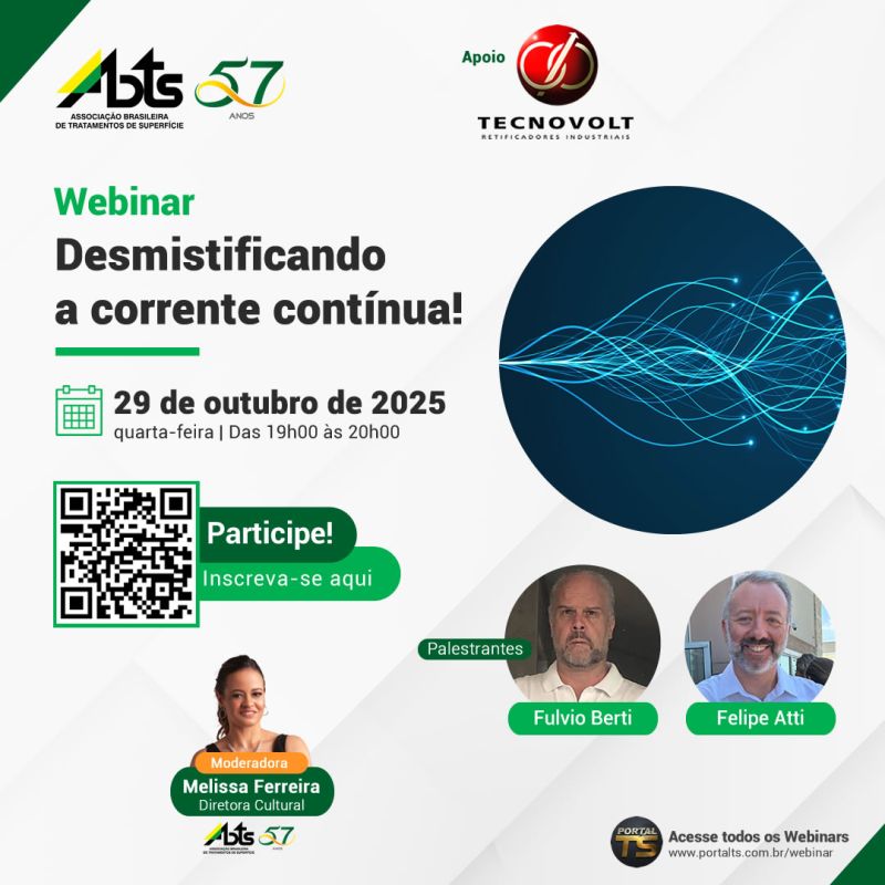 Webinar - Desmistificando a Corrente Contínua Webinar ABTSABTS21 de outubro de 2025 | Por: Portal TS Mais notícias 1 TS 248TS EdiçõesMatéria Técnica Comercial Vernizes Cataforéticos: Proteção, Eficiência e Estética com Sustentabilidade 17 de outubro de 2025 2 TS 248CapaMercado Cromo Trivalente e Post Dip TRISTAR SHIELD: Inovação Sustentável em Revestimentos Decorativos e Funcionais 09 de outubro de 2025 3 TS 248TS onlineMatéria Técnica Comercial Substituição do Cromo (VI) em Processos de Eletrodeposição Decorativa 20 de outubro de 2025 4 ABTSMercado Curso de Tratamentos de Superfície em Manaus reúne mais de 75 participantes 13 de outubro de 2025