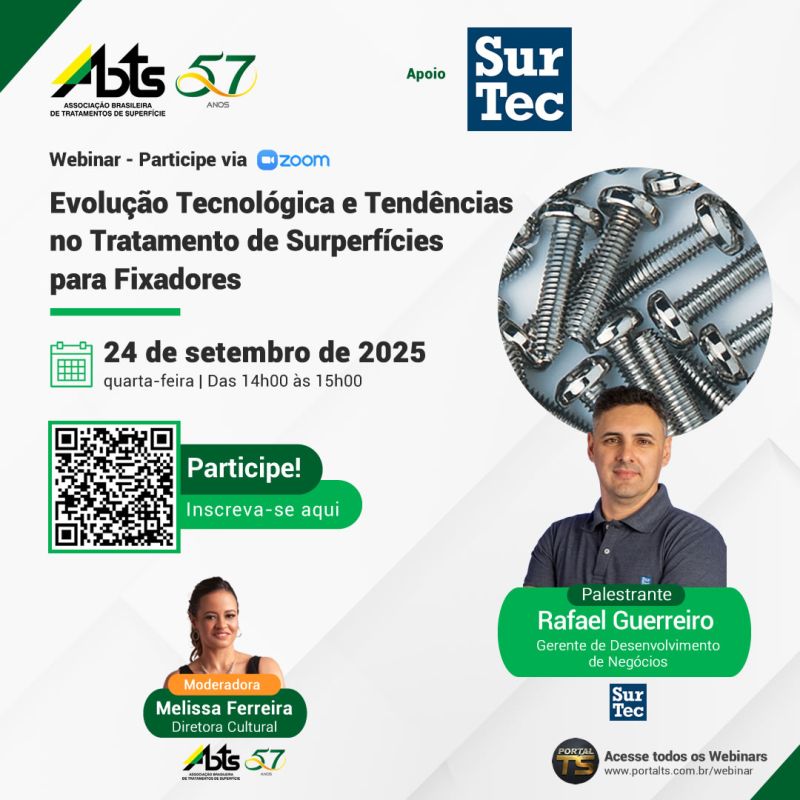 Webinar - Evolução Tecnológica e Tendências no Tratamento de Surperfícies para Fixadores Webinar ABTSABTS09 de setembro de 2025 | Por: Portal TS Mais notícias 1 TS 248TS onlineMatéria Técnica Comercial Substituição do Cromo (VI) em Processos de Eletrodeposição Decorativa 20 de outubro de 2025 2 Webinar ABTSABTS Webinar - Desmistificando a Corrente Contínua 21 de outubro de 2025 3 ABTSMercado Curso de Tratamentos de Superfície em Manaus reúne mais de 75 participantes 13 de outubro de 2025 4 TS 248TS EdiçõesMatéria Técnica Comercial Vernizes Cataforéticos: Proteção, Eficiência e Estética com Sustentabilidade 17 de outubro de 2025